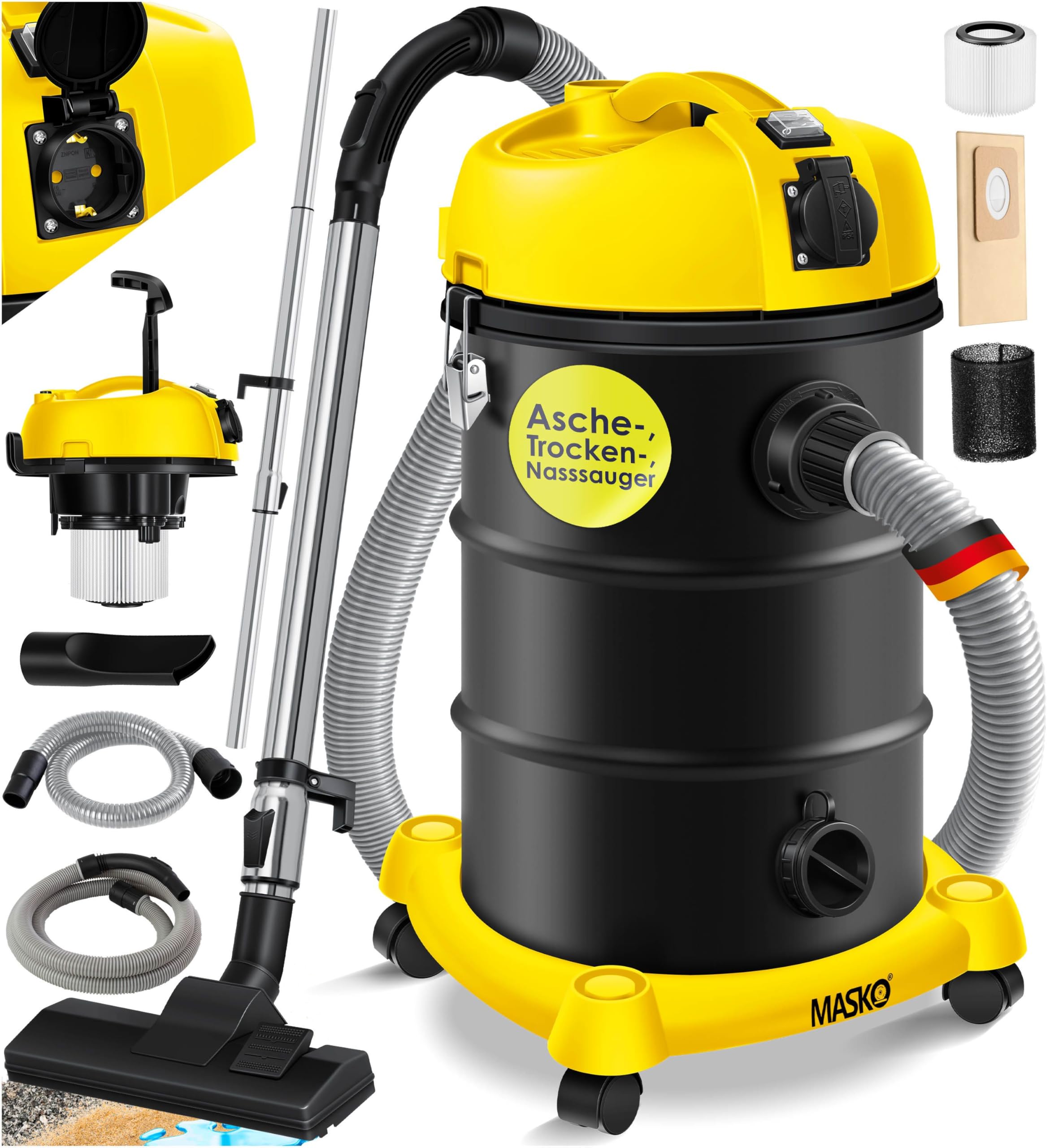 Masko® 6IN1 Aspirador Industrial en seco y húmedo de Cenizas 2300W + Toma de Corriente Función de soplado en seco y húmedo | sin Bolsa (Gelb)