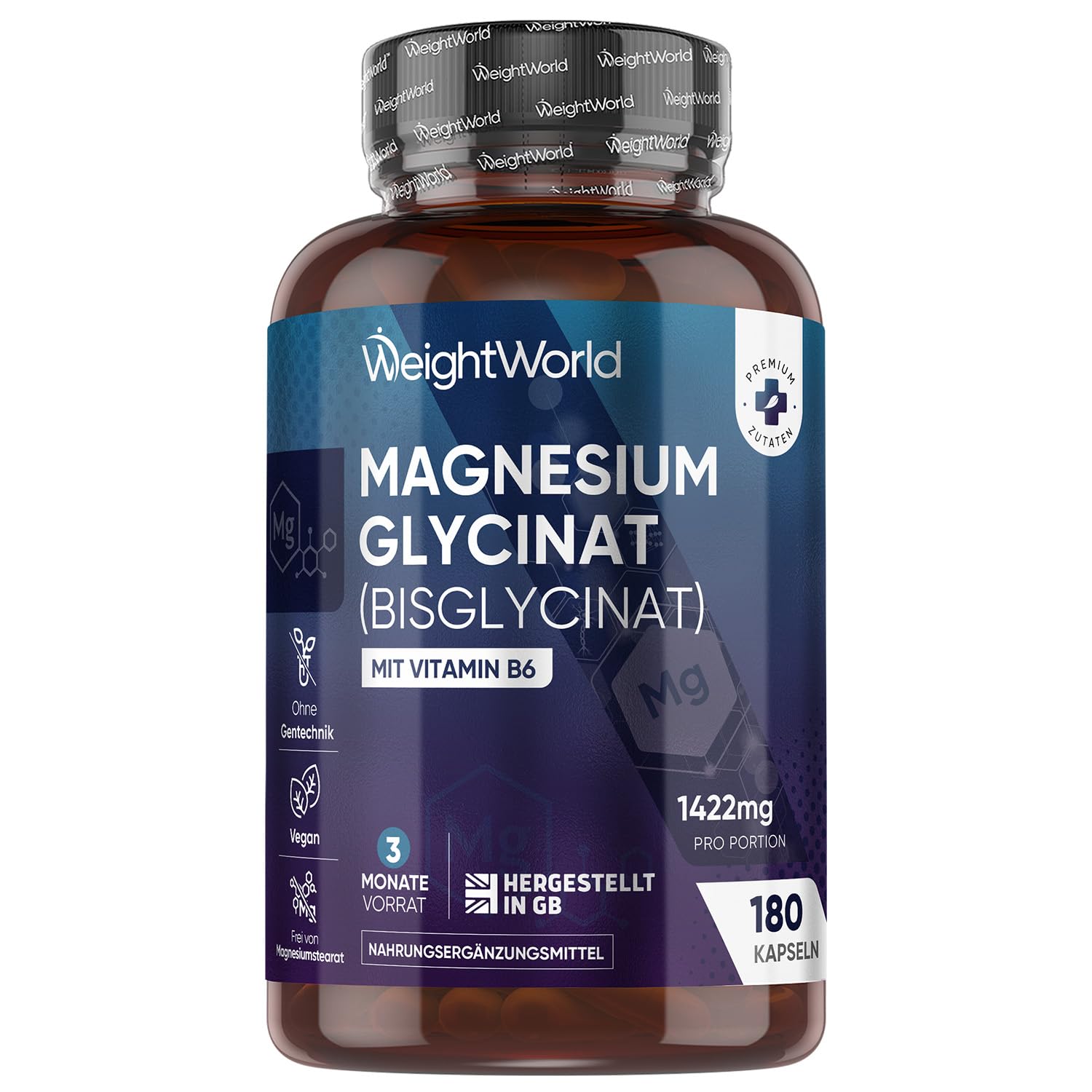 Magnesium Bisglycinat Kapseln - 1422mg Magnesiumbisglycinat mit Vitamin B6-200mg elementes Magnesium - Glycinat Form - 180 vegane Kapseln - 3 Monate Vorrat - Frei von Magnesiumstearat - WeightWorld