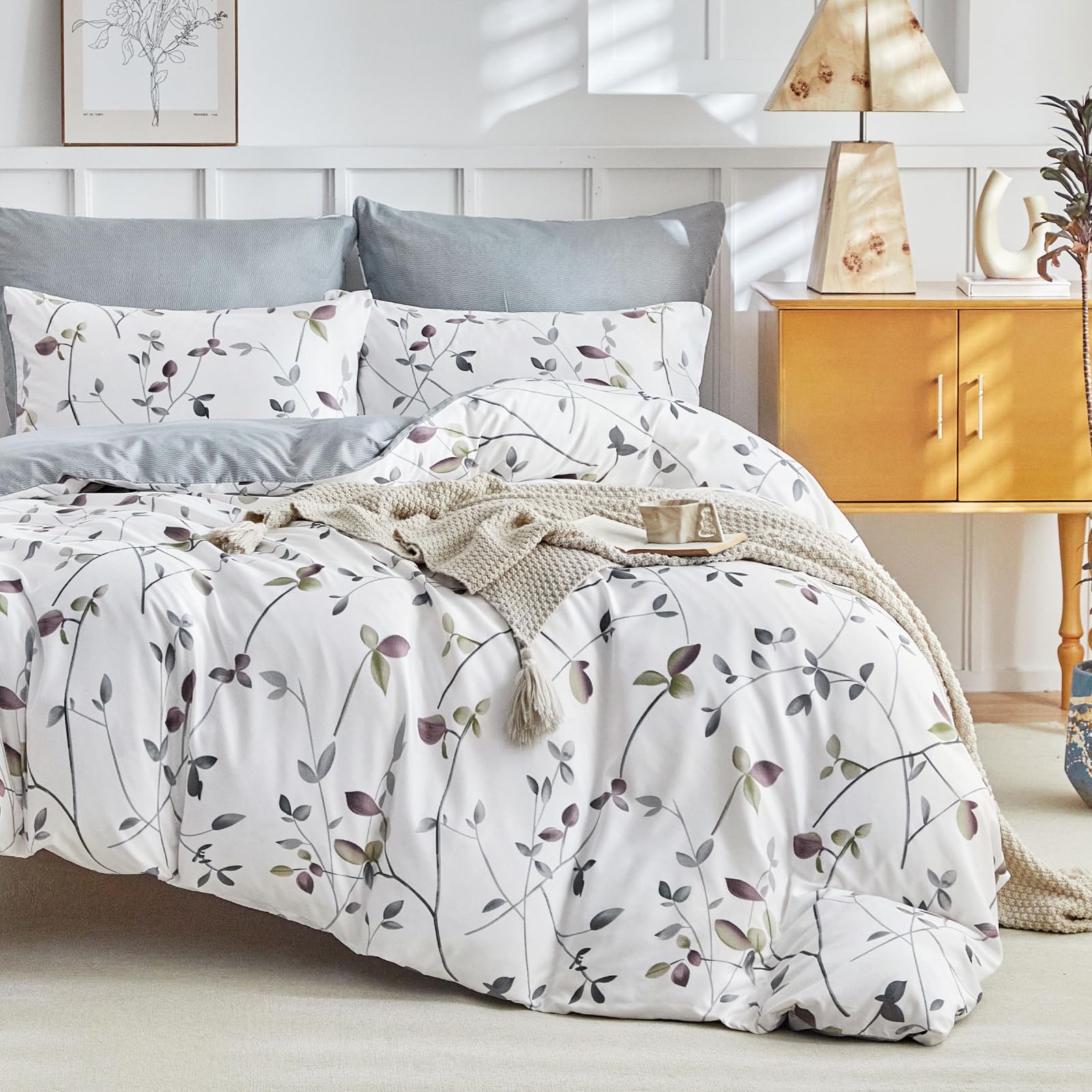Tokokimo Funda Nórdica Cama 135/150, Funda Nordica 220x240,Funda Edredon con Ramas y Hojas Patrón Microfibra 3 Piezas Compuesto por 1 Funda Nórdica 220x240 + 2 Fundas de Almohada 50x75, Blanco/Gris